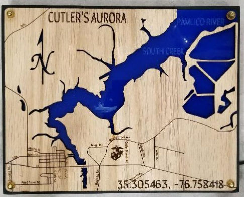 The blue text will be engraved. Note that the bodies of water are engraved into the blue acrylic, often outlined to make them easier to read.