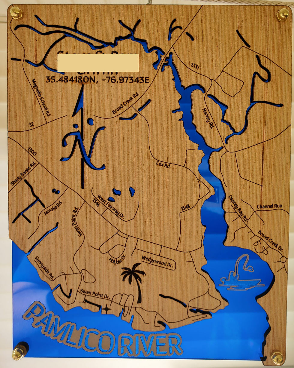 The blue text will be engraved. Note that the bodies of water are engraved into the blue acrylic, often outlined to make them easier to read.